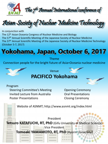 We are pleased to inform you that the 7th international meeting of Asian Society of Nuclear Medicine at October 6 2017 in Yokohama, Japan. The 7th ASNMT will be held in conjunction with The 12th Asia Oceania Congress of Nuclear Medicine and Biology (12th AOCNMB), The 57th Annual Scientific Meeting of the Japanese Society of Nuclear Medicine (57th JSNM) and The 37th Annual Meeting of the Japanese Society of Nuclear Medicine Technology (37th JSNMT).