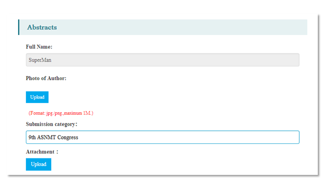 - STEP 3:Upload abstract, please choose 9th ASNMT Congress